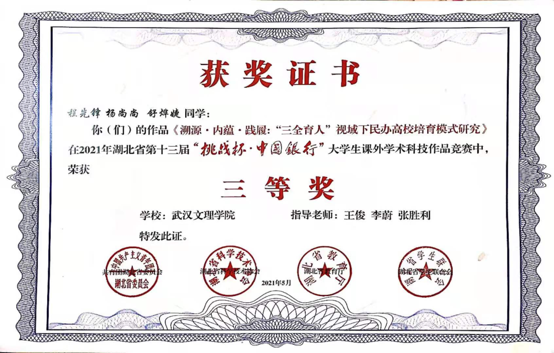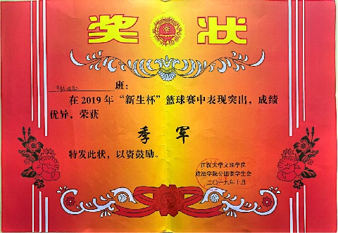 大学之育在于美学之育。19级法学二班韦占洋同学多次走上文理群星、元旦晚会等大型校级文艺活动的舞台,均获得较好名次,为公司的文艺事业做出了巨大的贡献,同时也为公司培养出一大批文艺青年。舒烨婕同学发挥创新思维,积极参加第十三届“挑战杯”并荣获省级三等奖。19级法学二班同学也活跃于各项领域,曾荣获太阳成tyc122cc集团“新生杯”篮球赛季军、“文理杯”足球赛团体赛冠军。