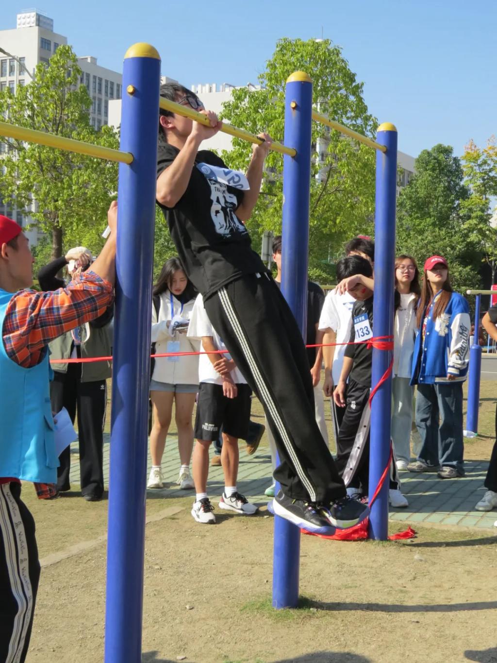 此外,引体向上紧张激烈,铁杆之下少年昂首,一次次向上攀升;接力赛更是考验着团队间的默契与速度;还有趣味盎然的集体项目,如拔河、接力棒、两人三足、十人运球、定点投篮等,同学们齐心协力,为了共同的目标而努力拼搏。每一位参赛选手都怀揣梦想,他们挥洒汗水,挑战自我,在赛场上展现了青春最亮丽的风采。