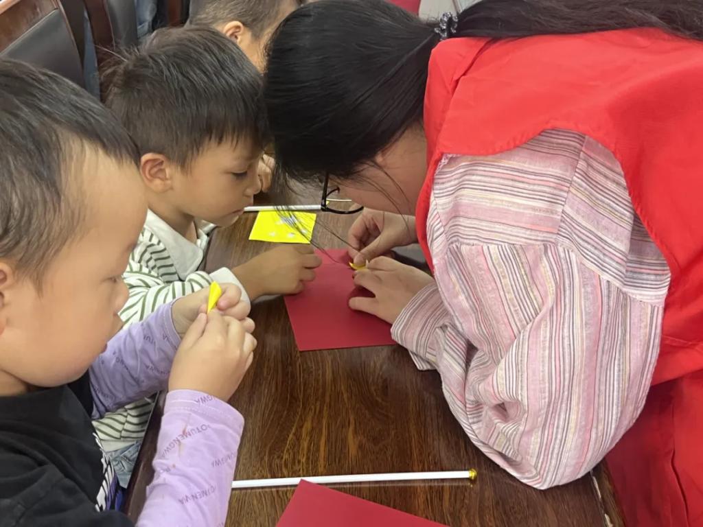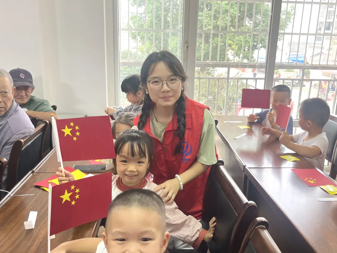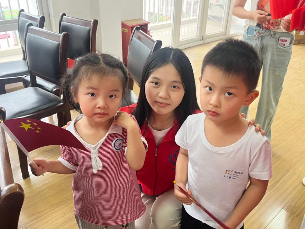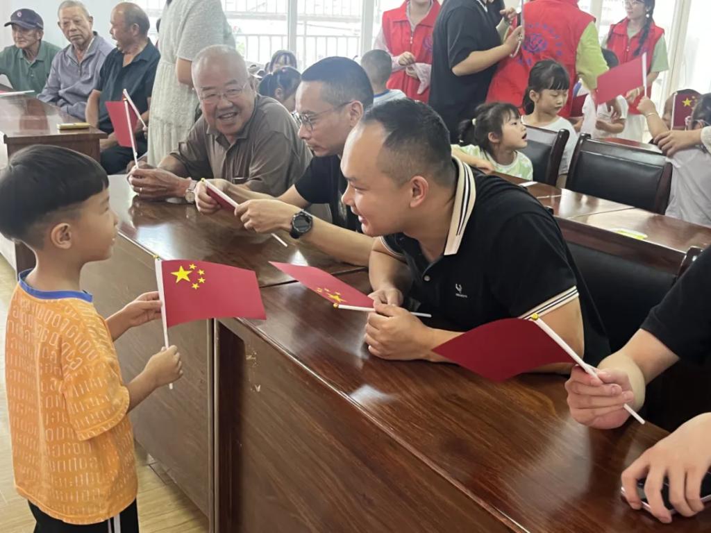 在完成五星红旗的制作后,小朋友们很快为它们找到了归宿——党员同志。大手拉小手,大国生小爱,一面五星红旗,连接的不仅仅是老党员同志与少年,更是祖国的前浪与后浪、一个时代先驱力量与后继力量。