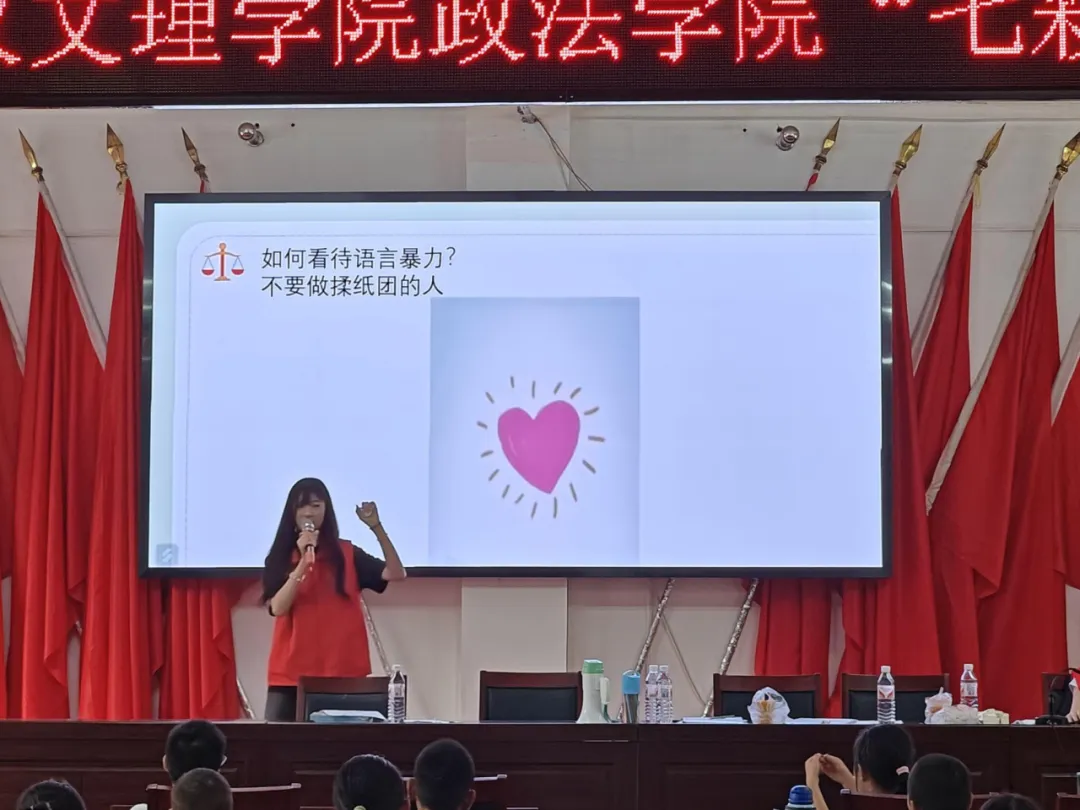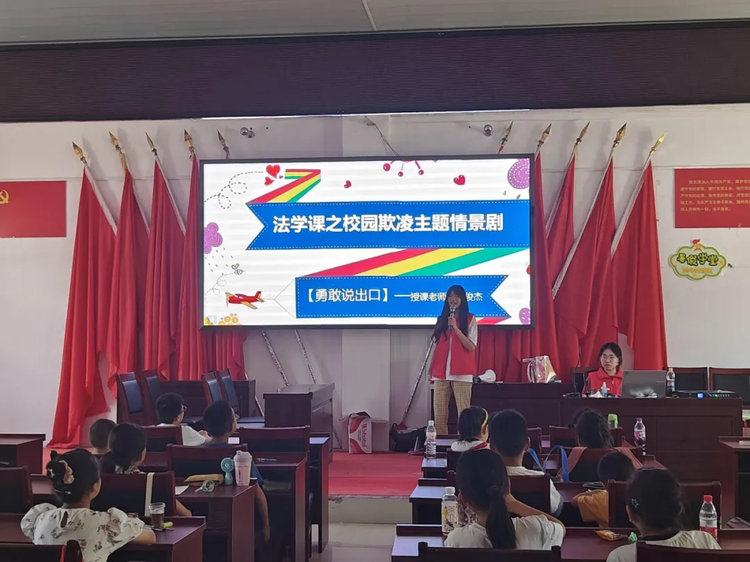 最后,在志愿者们的共同组织下开展了一场模拟法庭。首先由志愿者吴俊杰介绍法庭人员的基本组成和各自含义,用简洁明了的语言让小朋友们知道每个职位的职责和作用。随后邀请小朋友们上台参与扮演,体验模拟法庭的整体流程,让他们看到霸凌者因一时之想而收到严峻惩罚的过程,明白霸凌不可为。