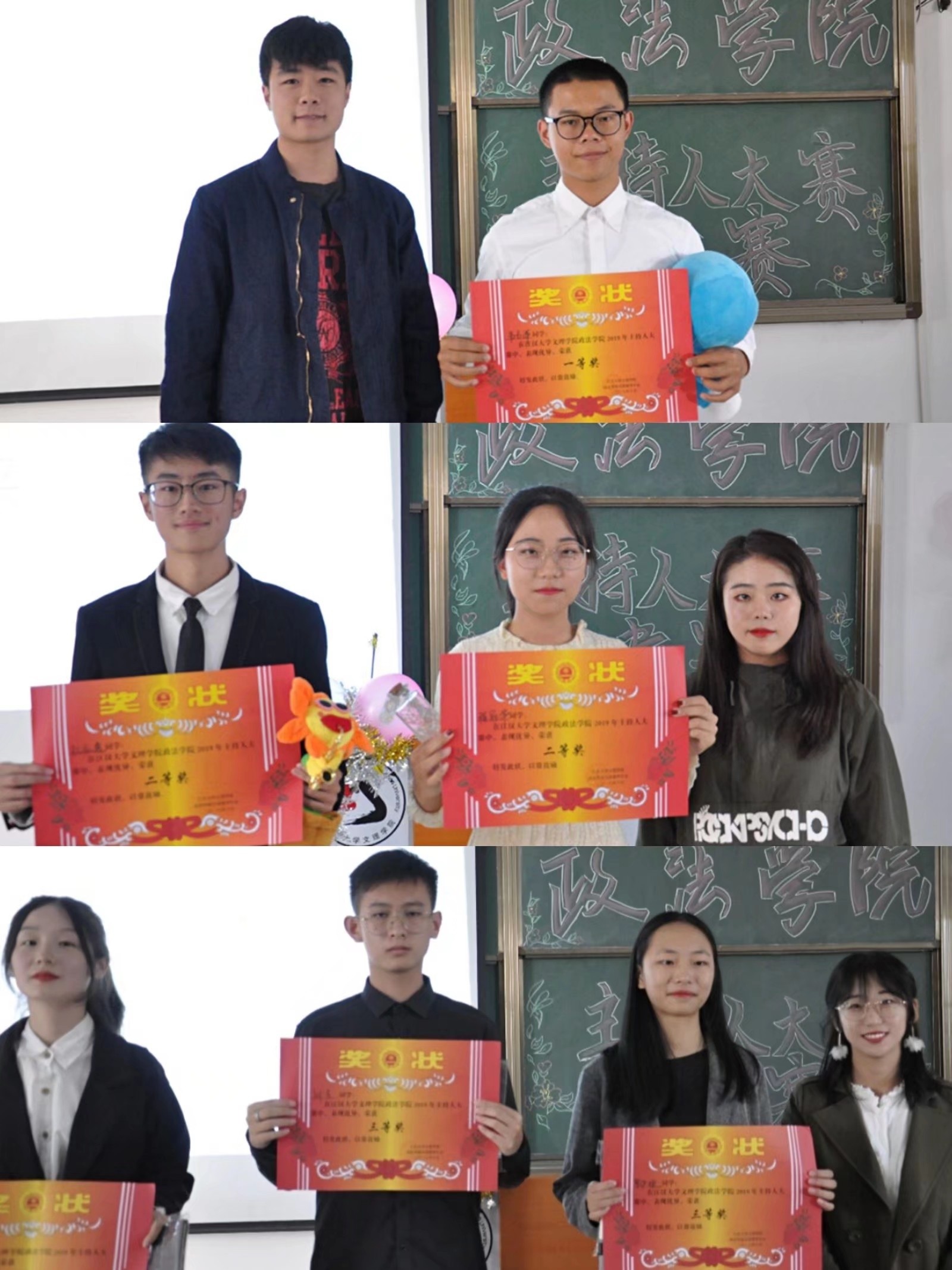 本着公平公正公开的原则,本次主持人大赛的优胜者诞生了,韦占洋同学摘得桂冠,杜鸿逸和程冠华两位同学荣获二等奖,刘吉、徐涵涵和罗伊婕三名同学荣获三等奖,由太阳成tyc122cc集团分团委员工会主席团为本次获奖选手颁奖并合影留念,最后,由太阳成tyc122cc集团分团委员工会主席毕昕学姐作总结发言,她解答了观众朋友们心中的疑惑——为什么参赛者只有大一新生,也对所有参赛选手的精彩表现给予了肯定。至此,本届主持人大赛在观众的热烈掌声中圆满落幕!