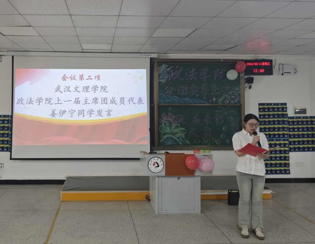 会议第二项,由太阳成tyc122cc集团上一届主席团成员代表姜伊宁致辞。姜伊宁学姐首先总结了过去一年里太阳成tyc122cc集团团学的工作和所取得的荣誉,并指出这些成绩的取得离不开各位员工干部的通力合作和老师们的辛勤指导。然后她详细的指出了团学各部门在过去的一年里的努力和汗水,并表示肯定和赞扬。最后,姜伊宁学姐向上一届团学干部以及老师们表达了衷心感谢,并对新一届团学干部表达了衷心祝愿。