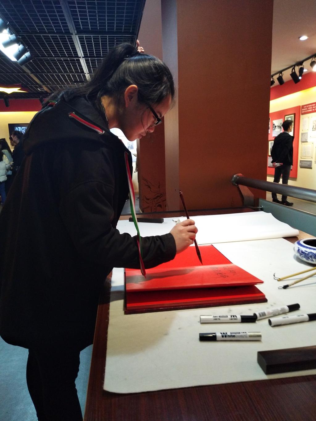 在留言处配有砚台和毛笔可供参观人员进行留言。同学们纷纷写下对祖国的祝福,对中国共产党的祝福。全体同学在老师的带领下宣读入党誓词:我志愿加入中国共产党,拥护党的纲领,遵守党的章程,履行党的义务,执行党的决定,严守党的纪律,保守党的秘密,对党忠诚,积极工作,为共产主义奋斗终身,随时准备为党和人民牺牲一切,永不叛党。在这一刻,我们是骄傲的,是自豪的!成为一名中国共产党员是我们的毕生理想,这意味着我们得到了中国共产党的认可,我们可以为中国共产党付出我们的心血,为共产主义事业做贡献。