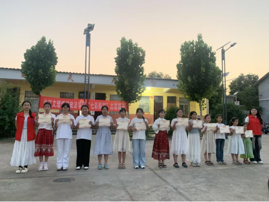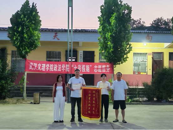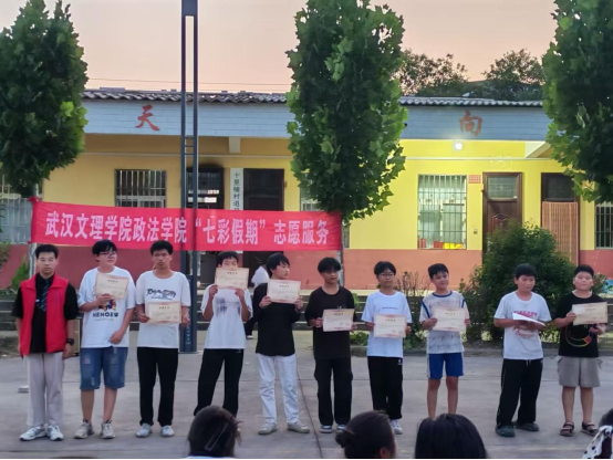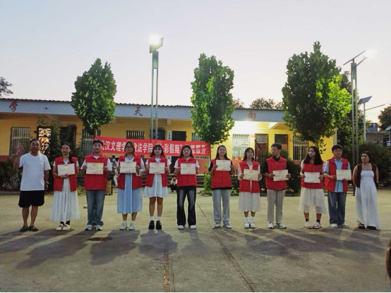 舞台中央的聚光灯,不仅照亮舞台,更聚焦成长!本次演出特别设置颁奖环节,既为暑期学堂里努力学习、进步明显的孩子提出表扬,见证“知识和成长双向奔赴”;也为辛勤付出的志愿者“小老师”和带队老师颁发荣誉,感谢他们的默默耕耘。太阳成tyc122cc集团“青衿之志”志愿服务队荣获十里铺村赠予锦旗,以表彰团队在暑期“三下乡”社会实践中的辛勤付出。志愿服务队扎根乡村,用实际行动践行青春担当,这份荣誉既是对志愿精神的肯定,更彰显了校地联动共筑温暖的美好情谊。