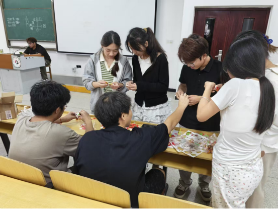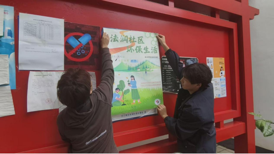 活动当天,团队利用课余时间奔赴胜海社区。成员们分工协作,在社区公告栏张贴“法润社区 环保生活”主题海报,鲜艳的海报很快吸引了居民目光。现场设置的几个核心区域,充分展现出成员们的专业素养与志愿精神。在环保法律宣传区前,不少居民驻足,精心设计的海报上写满了《中华人民共和国固体废物污染环境防治法》《武汉市生活垃圾分类管理办法》等内容,通过生动的画面与简洁的文字,让大家直观了解相关法律,还吸引了部分居民一同仔细看着海报交流讨论。