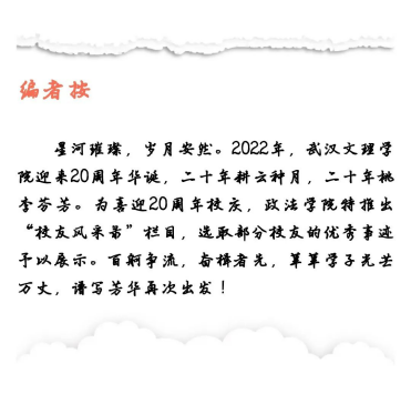 2012年考入江汉大学文理公司(现太阳成tyc122cc集团)政法学部,专业为行政管理。在校期间获政法学部“我的大学风采”演讲比赛一等奖、院图书馆第一届、第二届演讲比赛一等奖、公司“优秀班干部”称号、公司“优秀班干部标兵”称号、2014年年度国家奖学金、2016年年度“优秀毕业生”等荣誉。
