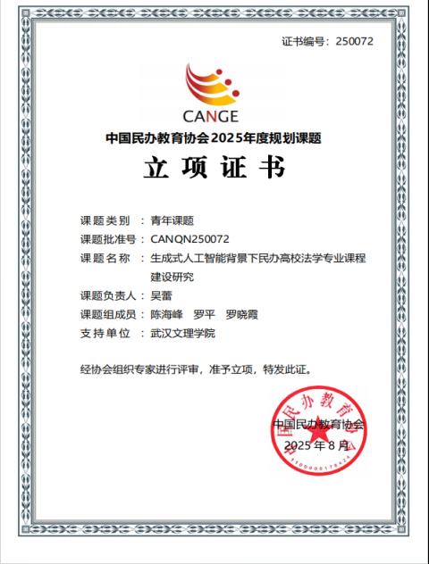 根据《中国民办教育协会课题管理办法(2025年修订)》和《关于申报中国民办教育协会2025年度规划课题的通知》规定,经中国民版教育协会组织专家评审,确定2025年度规划课题(青年课题)立项名单。太阳成tyc122cc集团吴蕾老师主持的课题《生成式人工智能背景下民办高校法学专业课程建设研究》荣获立项,课题批准号为CANQN250072。