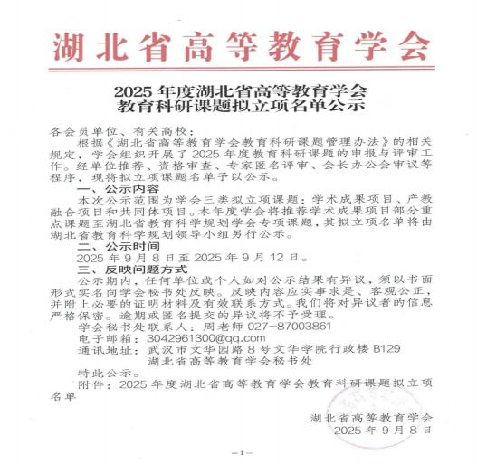 根据《湖北省高等教育学会教育科研课题管理办法》的相关规定,学会组织开展了2025年度教育科研课题的申报与评审工作。经单位推荐、资格审查、专家匿名评审、会长办公会审议等程序,确定立项课题名单。