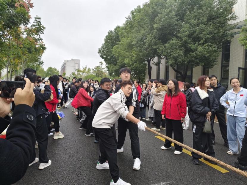 紧接着,教职工们来到了拔河赛场。两支队列紧握长绳,身体后倾、重心下沉,随着裁判哨声响起,双方瞬间发力,绳子中间的红线左右移动。场边师生组成的啦啦队,加油声一波高过一波,每一次绳子的轻微移动,都能引发全场欢呼,团队的凝聚力在这一刻被彻底点燃。