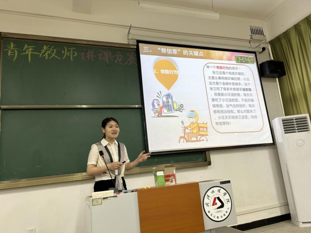 其中,汪慧老师由热点案例引入“帮信罪”这一教学重点,将生硬枯燥的法律条文转换为新颖有趣的讲解,教学特色展示得淋漓尽致,思路清晰,课件新颖生动,在短短的17分钟时间内充分展示了她的教学风采和教学特点,得到了评委们的一致好评,荣获此次竞赛二等奖。