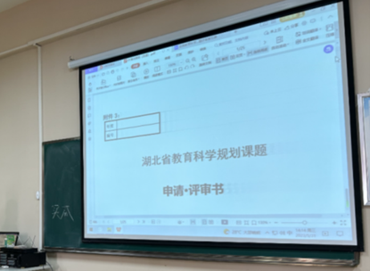 吕溪老师介绍了2022年6月撰写完成的《湖北省教育科学规划课题申请·评审书》,从申报书的选题、课题组成员选定、课题论证、可行性分析等各方面介绍经验,老师们认真倾听,并在陈经理带领下,探讨课题申报的关键因素。