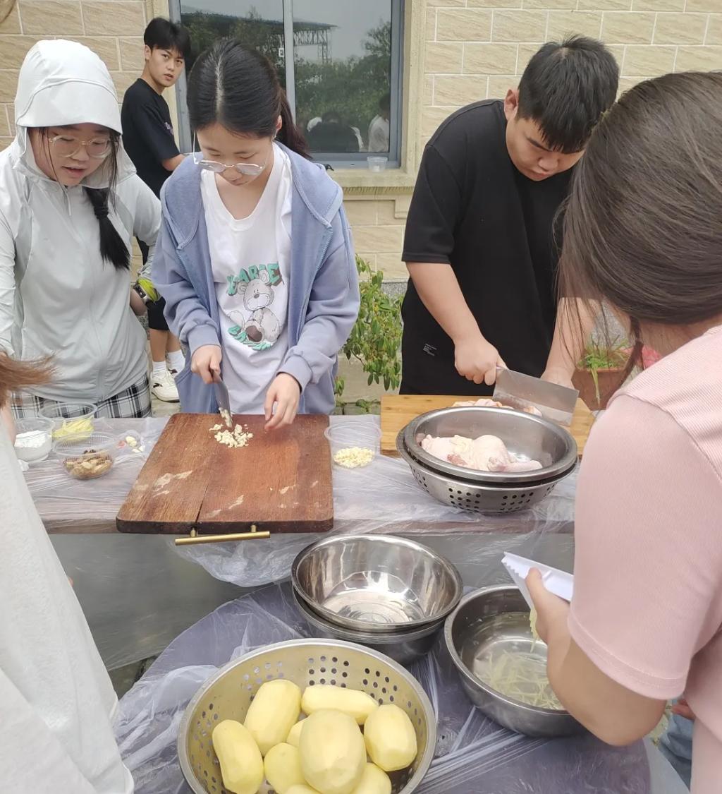 同学们积极参与劳动,有的洗菜刨皮,有的切肉剁鸡,大家分工有序,各显身手。不仅热爱做饭的同学能够充分发挥厨艺、施展才华,而且激发了“厨房小白”对做饭的兴趣,让同学们在劳动实践中学习做饭技能。最后,色香味俱全的饭菜端上了桌,同学们齐聚一堂,享受自己的劳动成果。