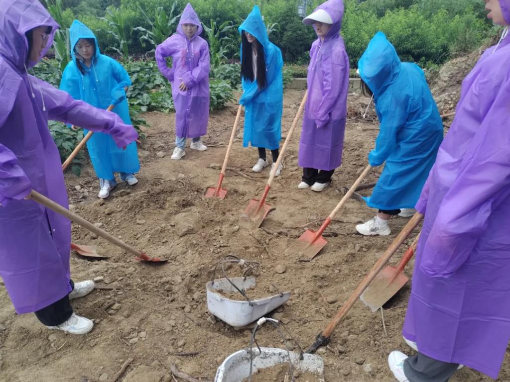 根据山庄的建设需要,同学们用锄头和簸箕等劳动工具将不平整的土地铲平,将石块和土堆运到指定地点。本项任务考验同学们的体力和团队协作能力,大家都团结起来,互帮互助,无论是艳阳高照,还是雨水纷飞,同学们都服从安排,圆满地完成了任务,为山庄的建设做出了贡献。